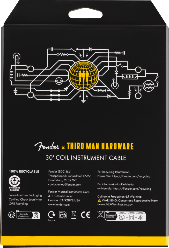 The Fender® x Third Man Hardware™ 30’ Coil Cable combines high-performance design with retro-inspired style. Featuring spiral shielding and durable nickel-plated connectors, this cable delivers reliability in the studio or on stage. Drawing inspiration from Third Man's bold aesthetic, the cable features a striking yellow PVC jacket and custom ends featuring the Third Man Hardware logo, adding a vintage flair to your setup. With its exceptional sound quality and timeless appeal, the Fender x Third Man Hardware Coil Cable brings a touch of Jack White’s legendary look to your performance.