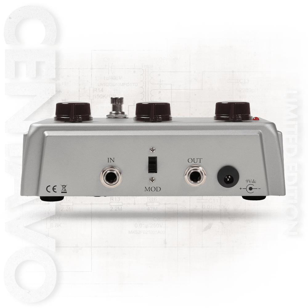 Whether you’re after the fabled boost tones, edge-of-breakup overdrive, or you want to push your rhythm channel to true grit, Centavo’s controls take you from tone sweetener all the way to saturated gain. The Centavo is comfortable acting as a boost pedal, but the saturation in the higher gain settings provide a platform for true “transparent” overdriven rhythm tones. The addition of the “MOD” switch on the back - famously requested by Jeff Beck on the original pedal- allows players to extend the bass response, impacting the lower strings to get added low end drive tones.