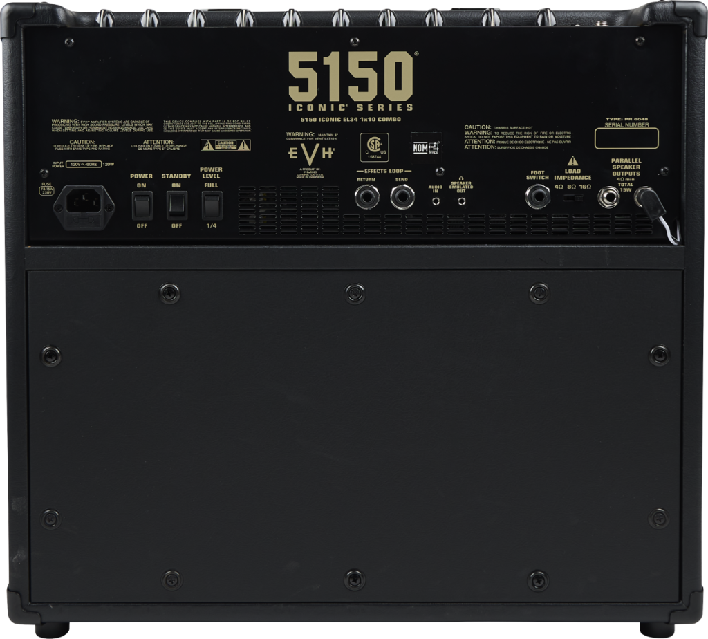 Sporting sophisticated and distinctive EVH style, the 5150 Iconic Series 40-watt 1x12 combo is wrapped in either Black textured vinyl with a black cloth front grille and features gold and black 5150 and EVH logo badges in the upper left and lower right corners. This all-tube combo is finished off with a brushed gold anodized aluminum top panel, vintage-style chicken-head knobs and molded black plastic top handle.