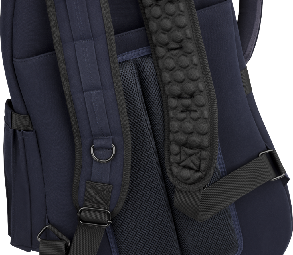 - Fixed, shock-absorbing EVA padded backpack straps with adjustable ladder lock buckles for a secure and comfortable fit