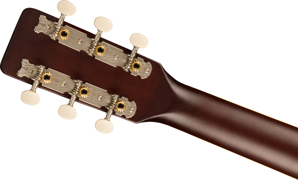 The X-braced body is crafted with select lightweight laminate tonewoods for an optimal balance of woody vintage tone and reliable durability, while the “C”-shape neck presents an inviting feel for hours of old-timey inspiration. Period-correct details such as a vintage-style pinned bridge, “G”-graphic pickguard, painted pinstripe purfling, 3-on-a-plate open-gear tuning machines and oversized dot fingerboard inlays combine for a nostalgic personality destined for any barnburner or jamboree.