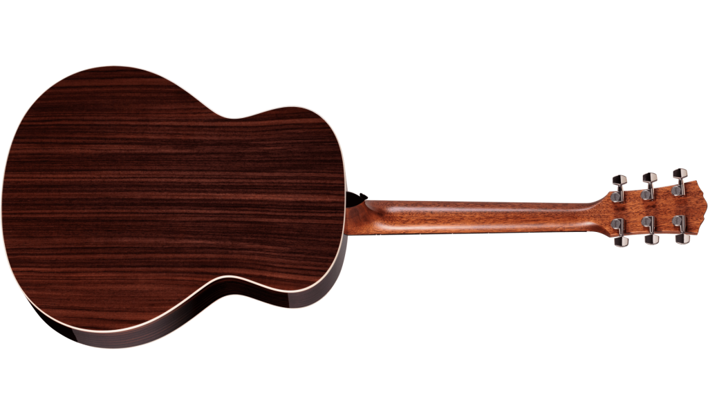 With its striking black top finish and cream-colored appointments, the Gold Label 714e Blacktop blends bold stage-ready visuals with old-school acoustic character. Solid Indian rosewood back and sides are paired with a torrefied Sitka spruce top in a gloss-finished Super Auditorium body, which is slightly longer and has a wider lower bout than our Grand Auditorium models. Voiced by a fanned variant of our V-Class™ bracing architecture, this model produces a deep, open voice with warm, resonant lows, warm trebles and richly textured overtones. Our special roasting recipe for the soundboard slightly darkens the spruce while adding a played-in character to its sound. A slender long-tenon Action Control Neck™ provides signature Taylor playability and allows for quick, precise string-height adjustments through the soundhole. Design elements exclusive to the Gold Label Collection include a distinctive pickguard shape and a modified headstock with an angled-back cut and script-style logo. Additional details include a Honduran rosewood Curve Wing bridge paired with Indian rosewood bridge pins, complemented by cream-colored accents throughout—rosette, pickguard, binding and matching Crest fretboard inlays. Equipped with LR Baggs Element VTC electronics and Taylor nickel tuners, the Gold Label 714e Blacktop ships in a Taylor deluxe hardshell case with a British Cocoa exterior.