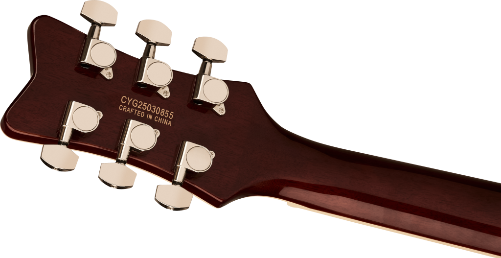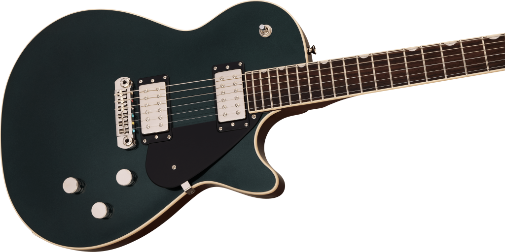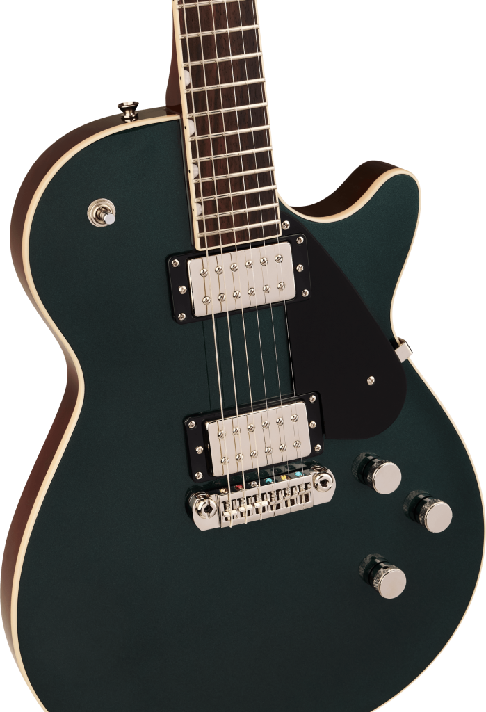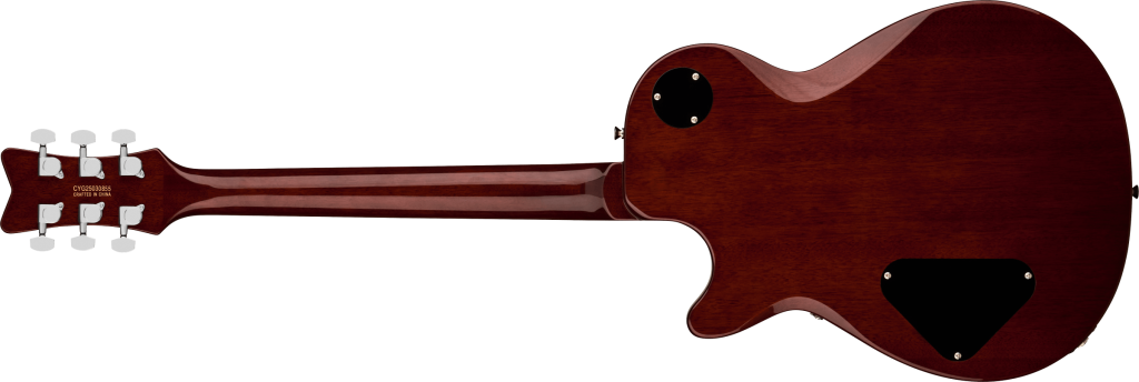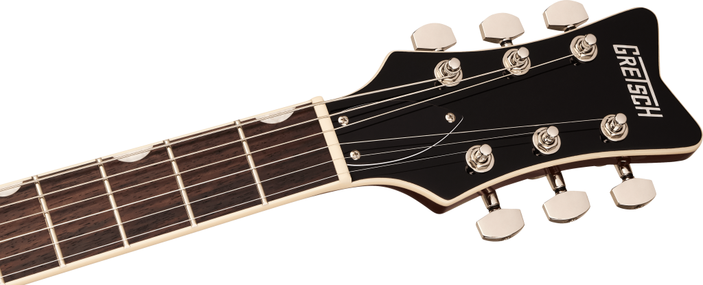 At the heart of each Electromatic Jet is a mahogany body with max core chambering and a carved maple top. Designed for exceptional acoustic balance, this precise combination delivers strong attack with a rich, present mid-range, big lows and shimmering musical highs. A smooth rounded heel allows for unimpeded access to the highest frets, while subtle comfort contours on the body create a balanced ergonomic fit for effortless playability and enhanced comfort.