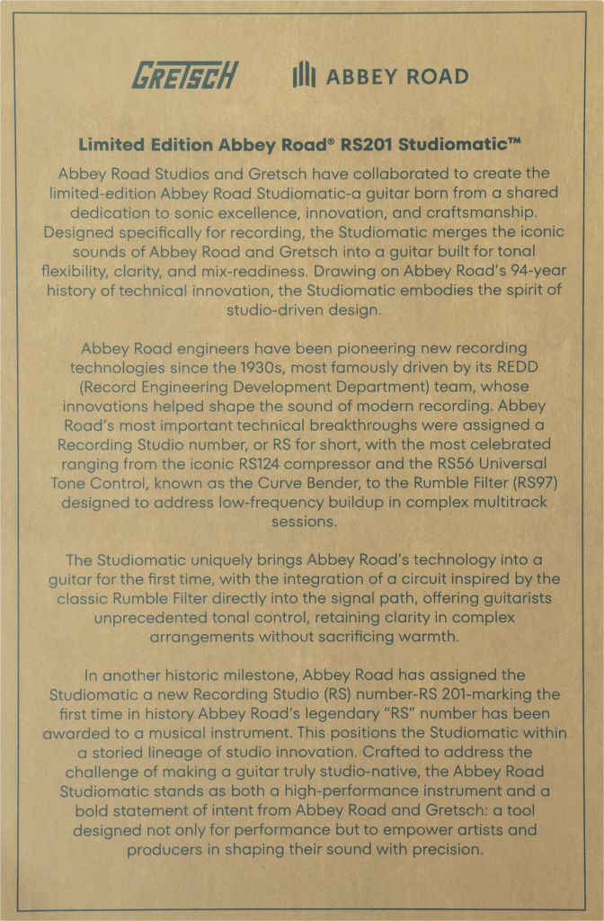 Gretsch is proud to partner with Abbey Road on the development and release of a very special Limited Edition guitar – the Gretsch Abbey Road Studiomatic™ Hollow Body. Featuring custom Filter’Tron™ pickups, and a custom-voiced Rumble Filter circuit developed in collaboration with Abbey Road sound engineers, the Abbey Road Studiomatic™ is not only an homage to the continuing legacy of Abbey Road Studios, but also a unique and incredibly versatile guitar.