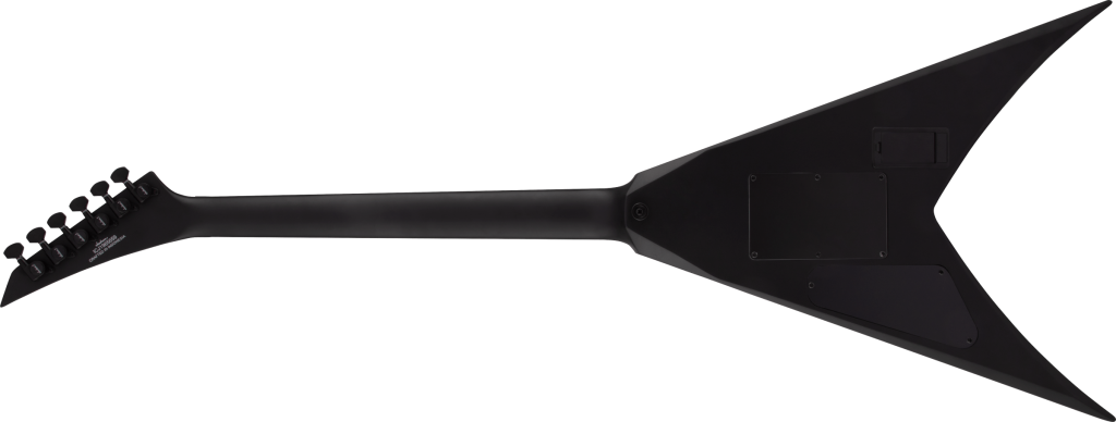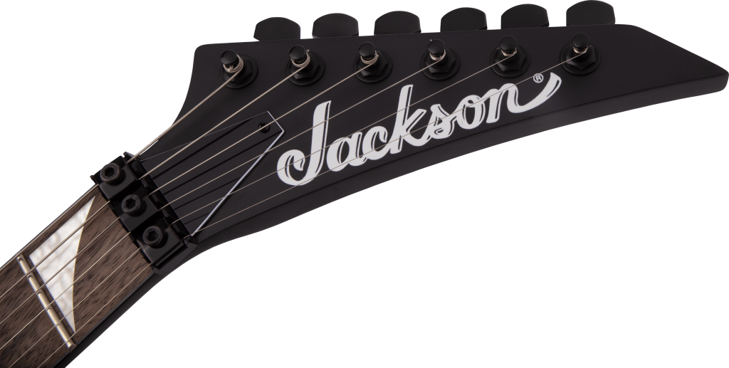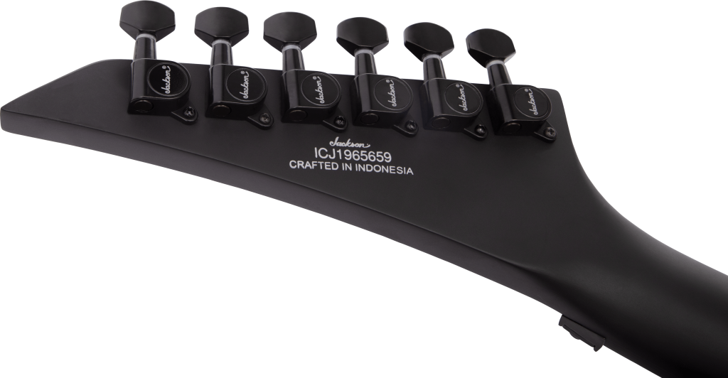 Cloaked in either Satin Black or Slime Green with Black Bevels, this royal axe is finished off with a Jackson pointed 6-in-line black headstock and black hardware.