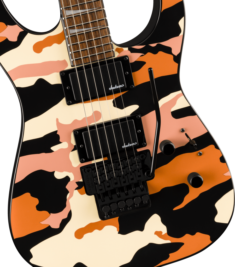 - Available in Butterscotch Camo or Winter Camo with matching Jackson pointed 6-in-line headstock and black hardware