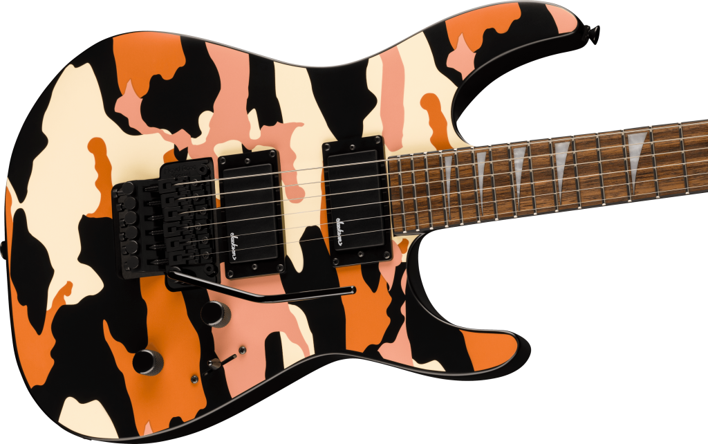 Our famed Jackson pointy headstock gets a color camo matched treatment for a bold statement.