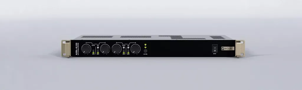 AURA-4H150 is a multichannel, 4x150 W RMS @ 70/100V, high efficiency amplifier (class D). AURA Series are built with the highest robustness for long lasting performances with special power supply circuitry designed for optimized electrical consumption and are 100% silent featuring convection cooling system. AURA Series also features the possibility of linking channels to the first input by selecting it on the rear panel, adjustable auto stand-by level, overload and thermal protection, PFC and anti-clipping system.