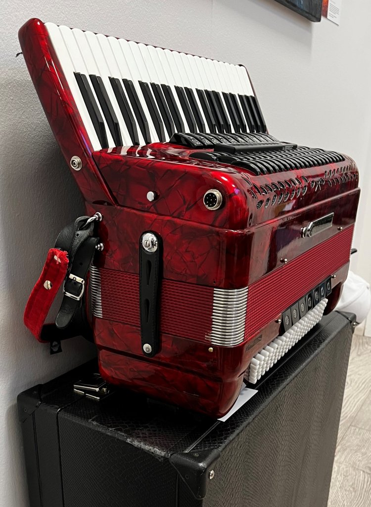 120 bassa 4ra kóra Borsini harmonikka. Smíðuð í Castelfidardo á Ítalíu, nikkuhöfuðborg heimsins. Ca. 20 ára gömul, en lítið spiluð og í góðu standi. Taska fylgir