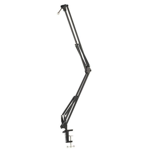 Smooth-running With 5/8" threaded connector for recording studios and multimedia workstations Black powder-coated Total length of the swivel arm: approx. 100 cm Maximum load capacity: 1.5 kg Incl. clamping brackets for table tops up to 6.5 cm thick